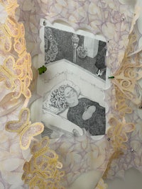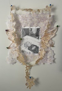 2023, “Aunt Annie,” Graphite in hand-cut paper frame and sculpted hanging ornaments